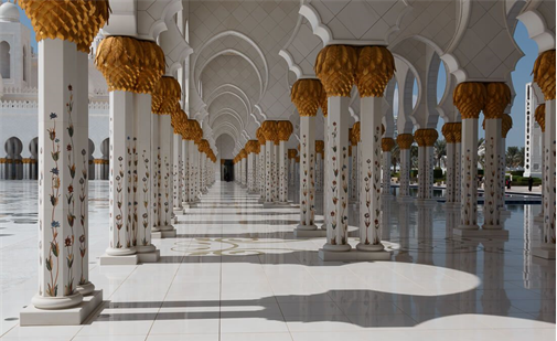 Tras cruzar el estanque por alguno de sus puentes, se llega a un corredor techado formado por 1096 columnas con detalles a base de incrustaciones de piedras semipreciosas. Entre las columnas, los arcos perfectos resaltan la belleza de este corredor que tiene forma de U, con la sala principal de la mezquita cerrando la U.