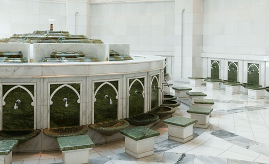 En las esquinas del corredor observarás unas escaleras mecánicas que dan acceso a una planta inferior donde encontraremos los aseos y dos salas de abluciones. Ambas salas de lavado están iluminadas de forma natural a través de sendas claraboyas y las zonas de lavado están construidas con mármol verde y blanco.
