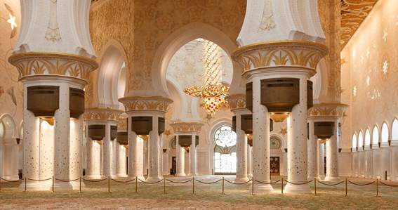 Finalmente se accede al punto más importante de la mezquita Sheikh Zayed, su sala principal o sala de rezo. Una sala de 50 por 55 metros recubierta de mármol blanco importado de Italia, pero de un blanco un poco más cálido que el del exterior. Las 96 columnas de las sala tienen incrustaciones de nácar predominando los motivos florales.